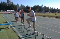 | 夏合宿。山形県は蔵王、坊平高原にやってきました。宿舎の前に芝のクロカンコースがありますが、上の写真はオールウェザーのグランドです。 | 左側はマネージャー、右は短距離の選手。練習中です。この日は、非常に良い天気でした。 | ||||||||