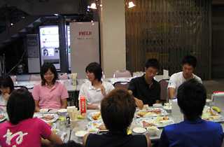 | 4年岩国、鈴木(禎)、短短のテーブル。主務の加瀬は電話中です。 | 田村主将が積極的に皆と交流を図ります。 | ||||||||||||